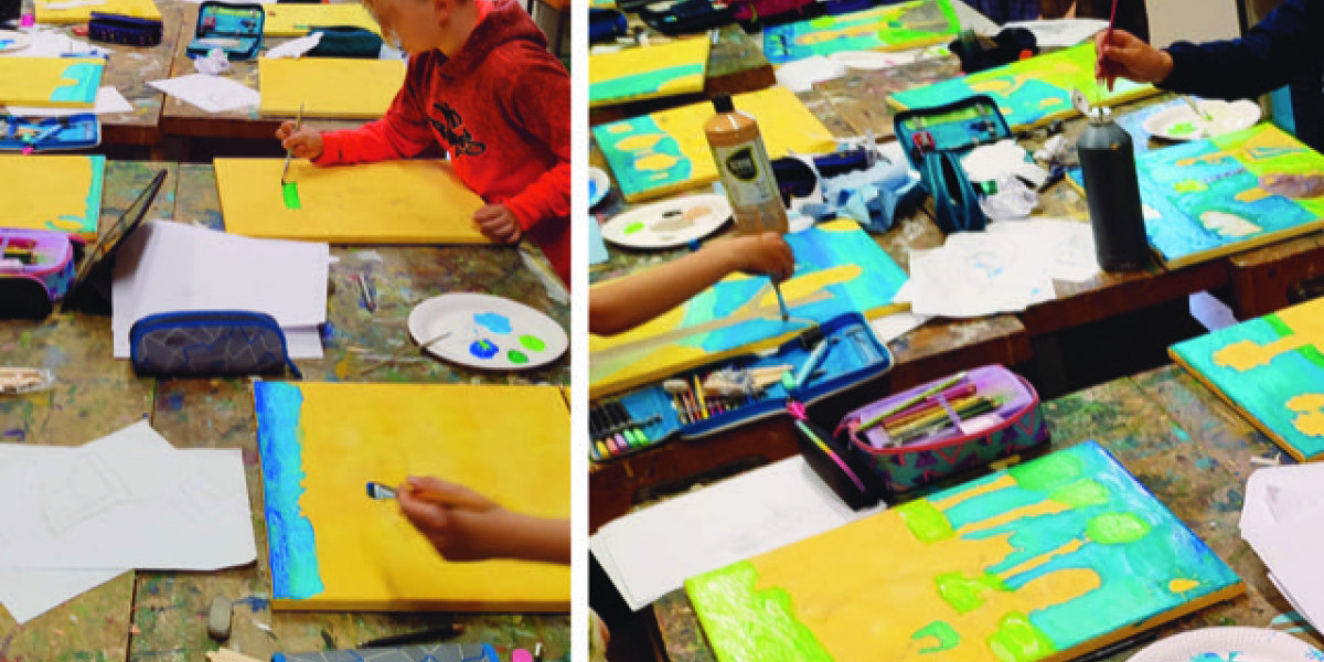 Einen Tag vor der Ausstellungseröffnung kommen die SuS mit ihren Bildern und Geschichten ins Freya-Frahm-Haus, um mitzuhelfen, die Ausstellung aufzubauen. Ihre Leinwände müssen an Schnüren befestigt und harmonisch angeordnet werden.