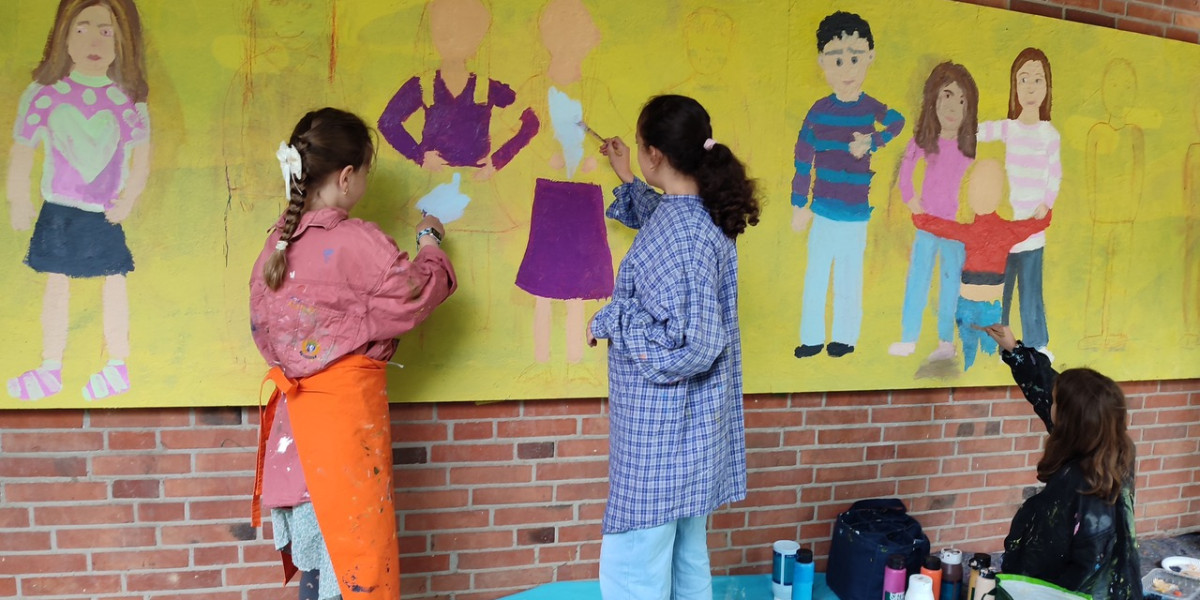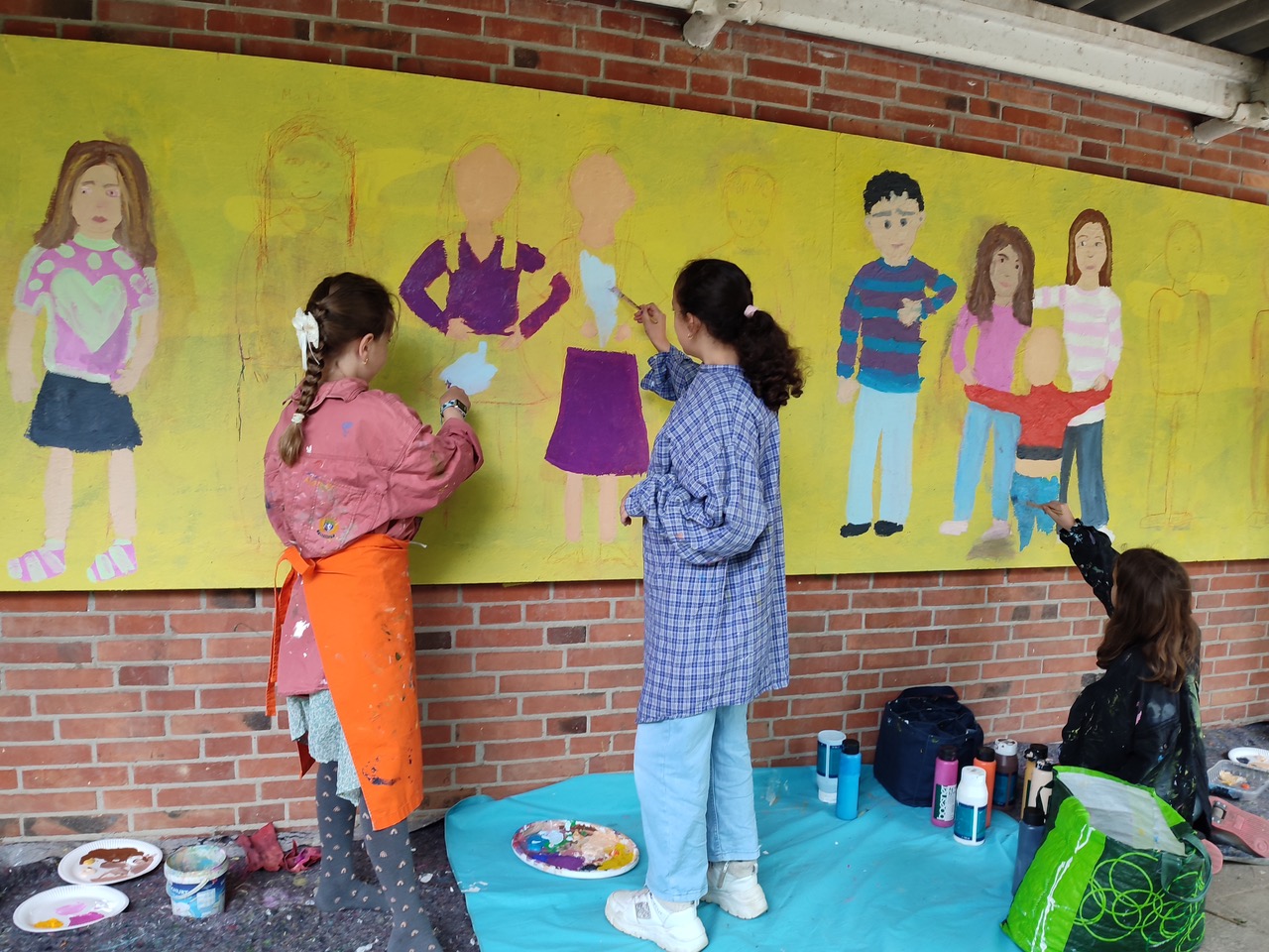 2. Phase (zweite fünf Monate): Arbeit mit Kindern der 3. Klassen. Hier lag der Schwerpunkt auf dem Erlernen und Darstellen der menschlichen Figur – Proportionen, Gesicht, Hände und Füße. Zunächst entstanden kleinere Zeichnungen und Malereien, anschließend konnten die Kinder ihre Figuren auch in Lebensgröße umsetzen. Etwa zwei Drittel der beiden 3. Klassen nahmen dieses Angebot wahr und verewigten sich mit großformatigen Figurenbildern auf einer rund 1 x 9 Meter großen Außenwand in der Nähe ihrer Klassenräume. Dieses Gemeinschaftswerk wurde zum sichtbaren Ausdruck der Kreativität und des Selbstbewusstseins der Kinder.