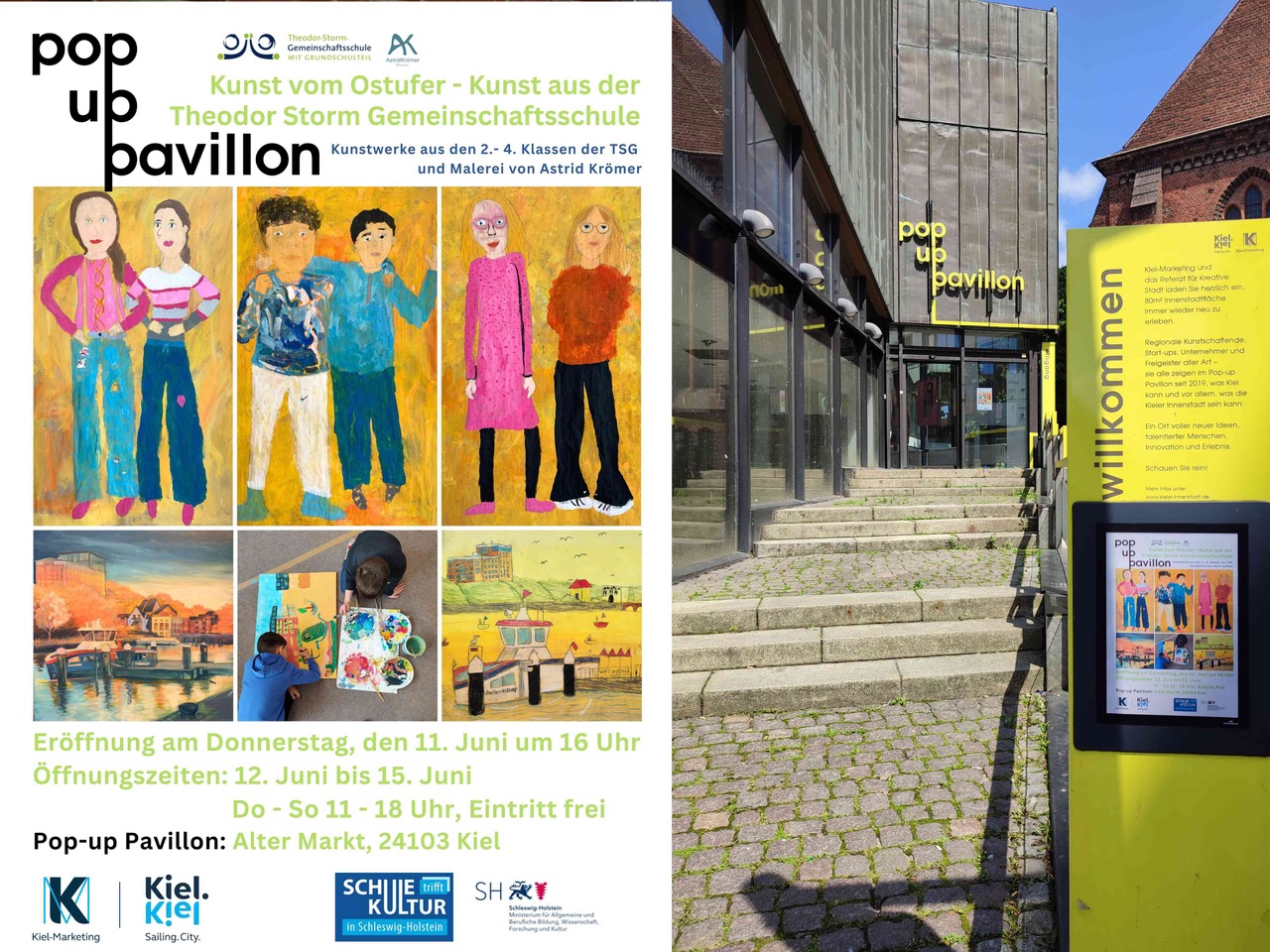 1. Phase (erste fünf Monate): Arbeit mit Kindern der 4. Klassen. Im Mittelpunkt standen die Themen Lieblingsorte und Stadtansichten. Da die Künstlerin Astrid Krömer seit vielen Jahren einen Kalender mit Kiel-Motiven gestaltet und während der Residenz an entsprechenden Bildern arbeitete, dienten diese als Inspiration für die Kinder. Die Schülerinnen und Schüler zeichneten mit Buntstiften und Kohle und malten mit Temperafarben eigene Stadtansichten. Die Aussicht, dass ihre Werke gemeinsam mit den Arbeiten der Künstlerin im Kieler Pop Up Pavillon öffentlich gezeigt würden, wirkte stark motivierend und es entstanden so ganz besondere Werke der Schülerinnen und Schüler.