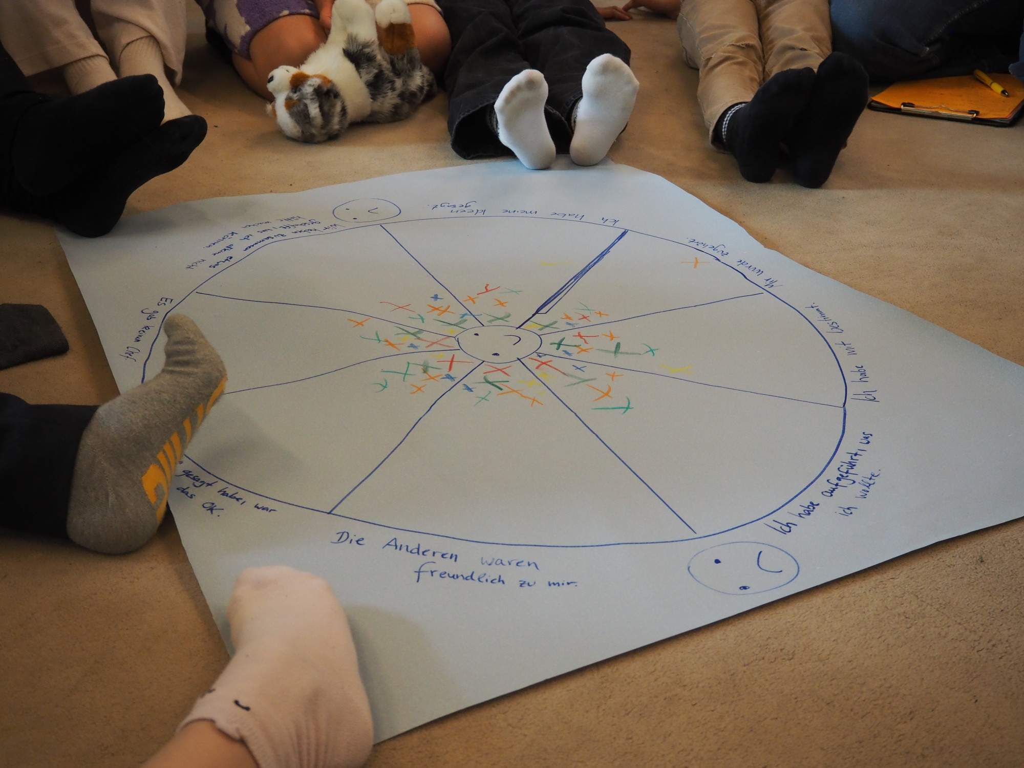 Am vierten Tag wurden die Schüler dazu aufgefordert zu überlegen, welche Ideen sie für die gemeinsame Abschlussaufführung am fünften und letzten Projekttag hatten. In Kleingruppen überlegten sie, was sie gerne auf die Bühne bringen würden, in welcher Form, wo sie es aufführen wollen und vor wem. Es entstanden unterschiedliche Ideen, die mit Hilfe der begleiteten Erwachsenen verbunden wurden. Hierbei konnten die Erwachsenen auf die Wortschöpfung der Schüler vom ersten Tag (Kompromisse sind wie Stracciatella Eis – wenn einer Schokoladen- und eine Vanilleeis essen möchte, man aber nur eine Kugel kaufen kann, nimmt man Stracciatella!) referieren und die Schüler so motivieren, gemeinsame Lösungen zu finden. Die Schüler entschieden sich für eine Theateraufführung einer selbst ausgedachten Geschichte im Arbeitsraum. Die Gegebenheiten des Raumes wurden für die Geschichte genutzt, Kostümteile und Schminke mitgebracht und die Schüler arbeiteten sehr motiviert an ihrem Stück, was sie am letzten Projekttag ihrer Patenklasse (Stufe 1) präsentierten. Der Probenprozess wurde immer wieder von kurzen Reflexionsmomenten unterbrochen, wo die Schüler ihre Zufriedenheit mit dem Prozess auf einer Zielscheibe mit Kreuzen oder in anderer Form vermerken mussten. So wurde sichergestellt, dass die Stimmen alle am Prozess Beteiligten wahrgenommen wurden. So entstand eine Aufführung, an der alle Beteiligte viele Freude hatten. Auch die zuschauenden Schüler hatten sichtlich Spaß.