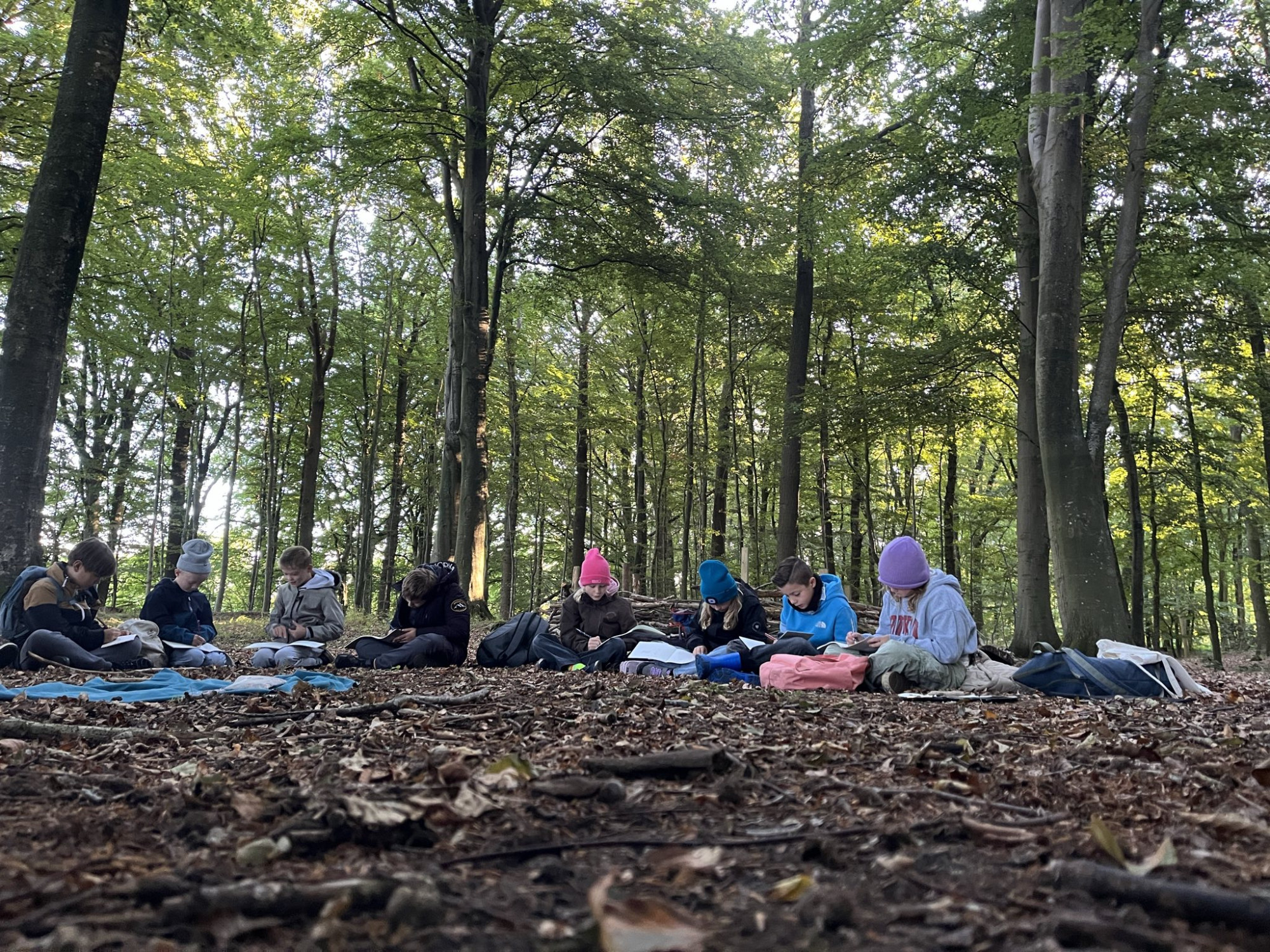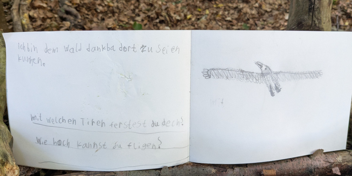 An Tag 3 näherten sich die Schüler*innen denen von ihnen abgezeichneten Tieren und Pflanzen, indem sie ihnen Fragen stellten („Wie groß ist deine Familie?“ „Warum bist du gefährdet?“ „“Turnst du gerne in den Bäumen?“). Im Anschluss schlüpften sie in deren Körperlichkeit oder Form und fühlten nach, welche Empfindungen in ihnen entstanden, wenn sie wie Eichhörnchen kauerten oder eine Douglasie alle überragten. Dann fanden sie den Ort im Schulwald, an dem sich ihr Tier oder ihre Pflanze wohlfühlen würde, weil sie dort die besten Lebensbedingungen vorfinden würden. An diesem Ort verweilten sie eine Weile, um ihn mit allen Sinnen wahrzunehmen und einen ersten Text aus Perspektive ihres Tiers/ ihrer Pflanze zu schreiben.